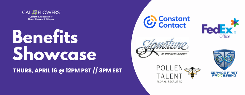 Join us for the CalFlowers Benefits Showcase, an informative forum designed to connect current CalFlowers' members with the exclusive products, services, and discounts available through our trusted partners. In just 45 minutes, members have the opportunity to explore valuable benefits that can save your business time and money while helping you grow and succeed. This is a casual, interactive event where you can move freely between vendor rooms, ask questions, and learn more about the benefits most relevant to your business.