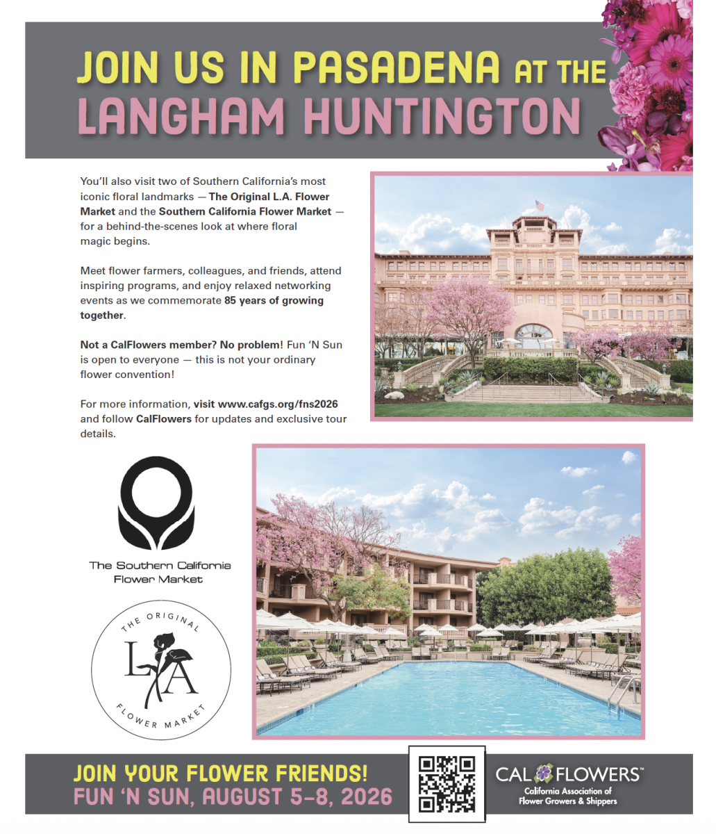 Get ready for the ultimate floral experience at Fun ’N Sun 2026, celebrating CalFlowers’ 85th anniversary under our new theme, “A Legacy in Bloom: 85 Years of Floral Excellence.” From August 5–8, we’re gathering at the iconic The Langham Huntington in Pasadena, CA, where floral artistry, industry innovation, and Southern California charm come together for an unforgettable event.